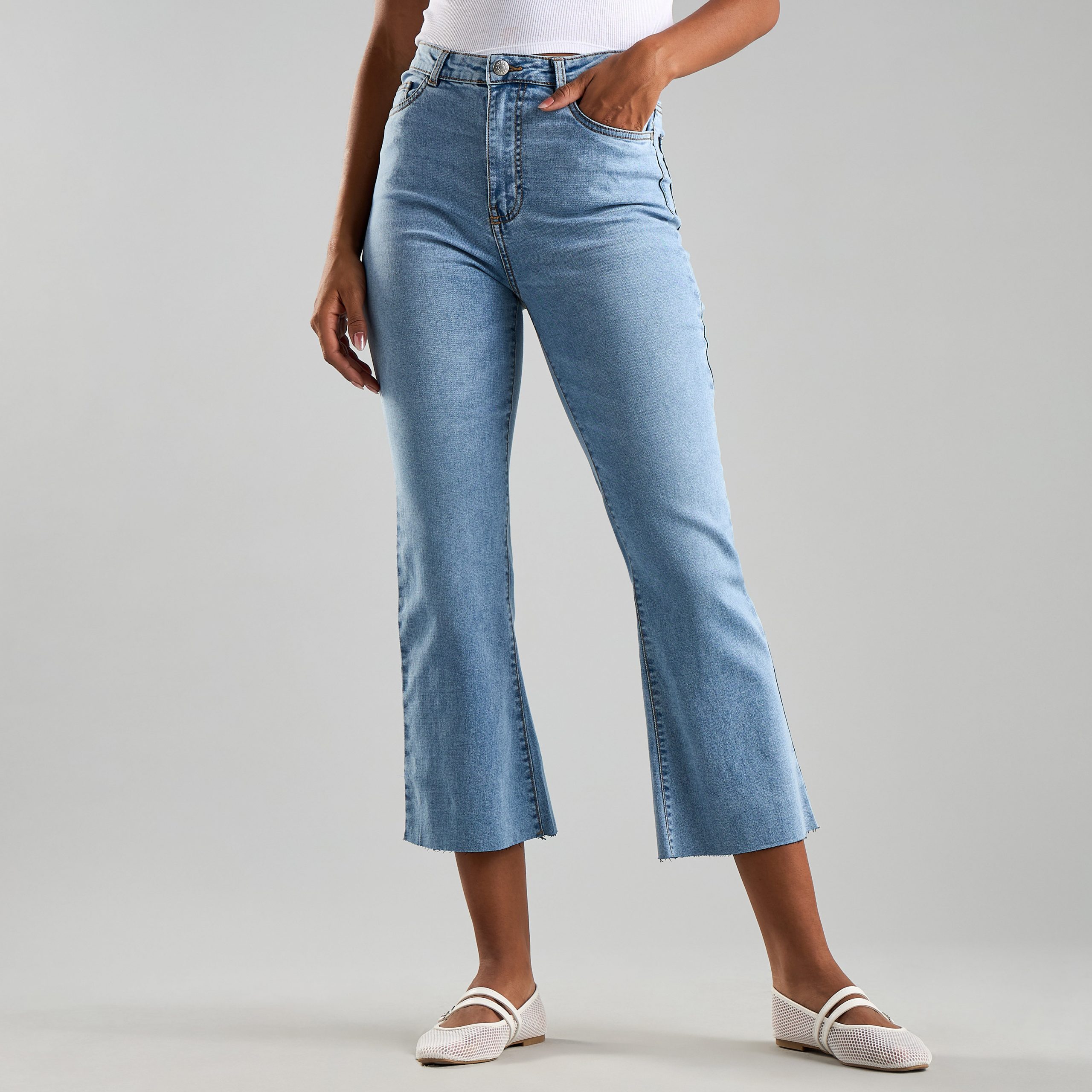 Trendy high-rise flared jeans with ankle-length cut, perfect for a flattering silhouette and casual outings.