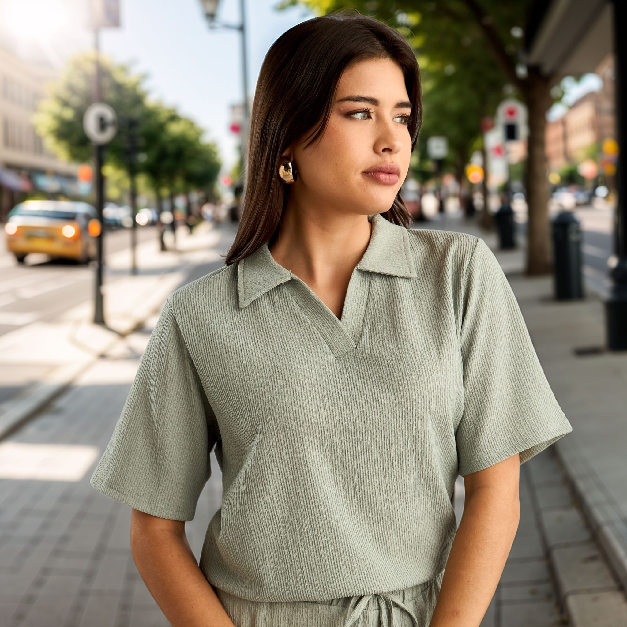 Soft, breathable top with textured fabric and a classic collar, perfect for casual or semi-formal wear.