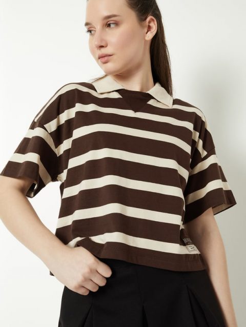 Women Striped Boxy Johnny Collar T-shirt